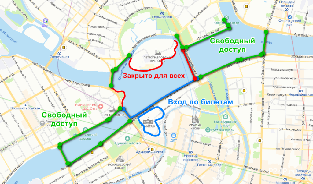 На Дворцовую набережную, Дворцовый мост и на Дворцовую площадь вход только по пригласительным билетам. Доступ на Троицкий мост, Стрелку Васильевского острова и набережную вдоль Петропавловской крепости закрыт для всех. А вот остальные места доступны для всех желающих бесплатно.