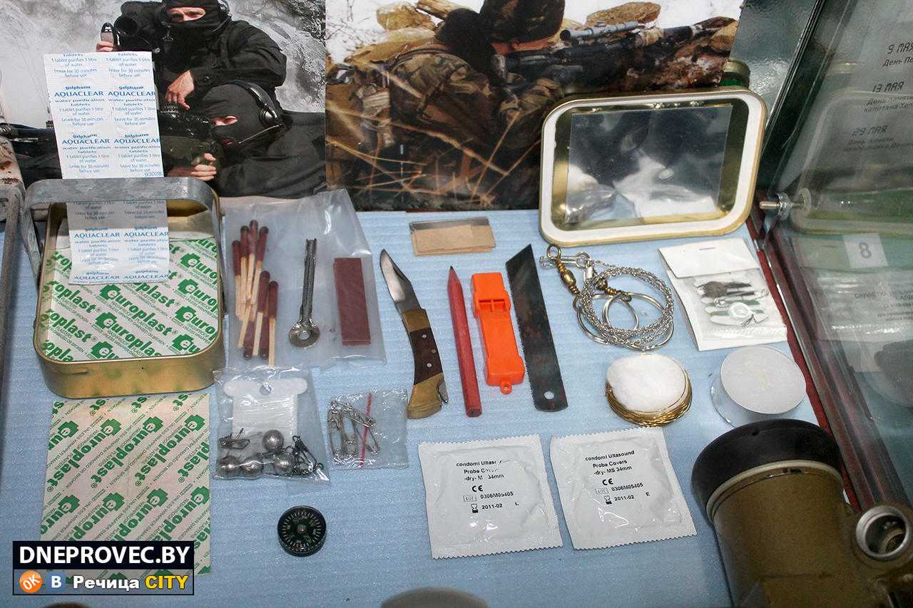 – Есть у нас и средства для подогрева продуктов питания в экстремальных условиях: например, вещества, при смеси которых образуется температура в 90 градусов, так можно подогреть любые консервы. Есть комплект выживания бойца американской армии: ножики, пилки, рыболовные крючки, емкости для воды, зеркальце, чтобы знаки подавать летчикам, которые будут искать разведчика.