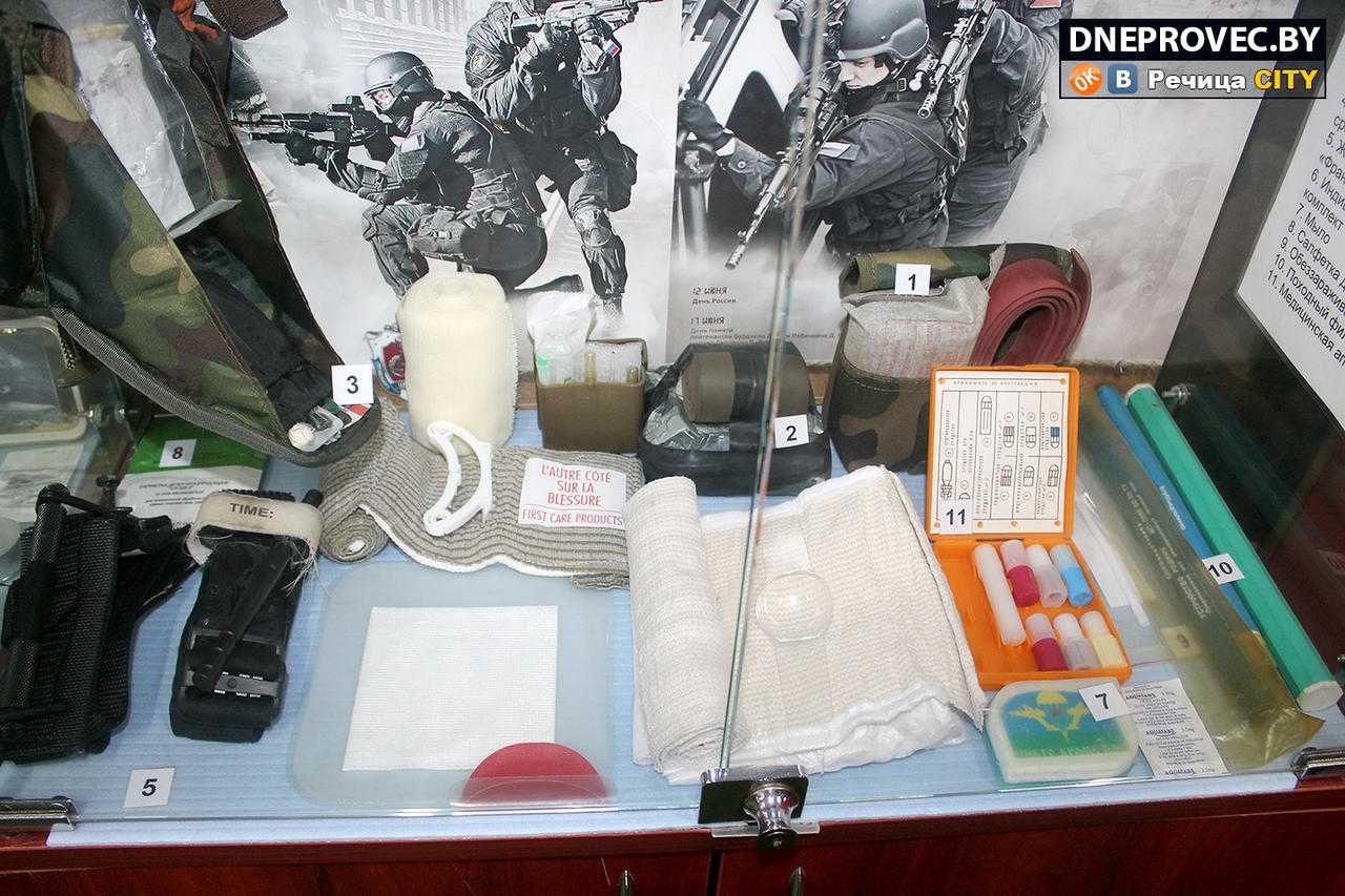 Имеются и редкие образцы современной тактической медицины. Представлены разработки разных стран, впереди планеты всей по изобретениям в этой сфере – Израиль. Мобильный гипс, средства обеззараживания воды и даже американская – с виду обычная салфетка – повязка, которая затягивает глубокие раны, когда нет возможности их зашить. Она накладывается на 5–10 минут и интегрируется в ткани, салфетка пропитана антисептиками.