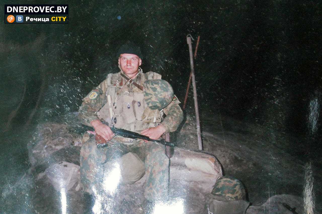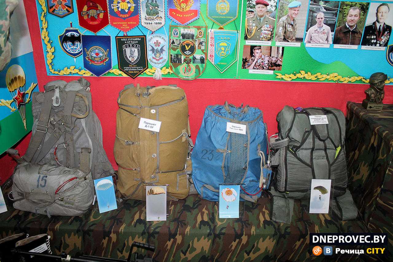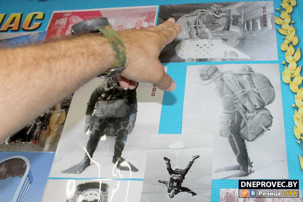 – Это макет классического парашютиста в такой же мини-диораме. Всё соответствует реальности: группировка, камуфляж. Костюм на нём нынешнего начальника Речицкого отдела Департамента охраны полковника Игоря Каршакова: он в нём служил в Чечне в 98-й гвардейской воздушно-десантной дивизии. Он у нас есть и на фото в этом костюме, еще молодой, красивый, стройный, – делится историей обмундирования манекена, парящего под потолком музея, наш экскурсовод. А затем уточняет: – Понятно, что прыжок с парашютом – это не самоцель, а способ доставки