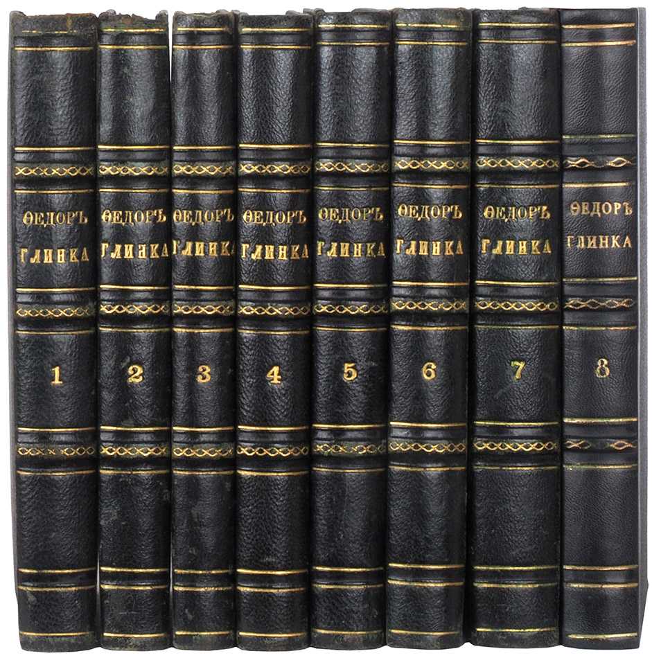 Все 8 книг представлены в одинаковых полукожаных переплетах эпохи. На форзаце каждого тома нанесен экслибрис библиотеки казака А.В. Леонтьева. В подобном состоянии и комплектности воспоминания Глинки нигде не встречаются.