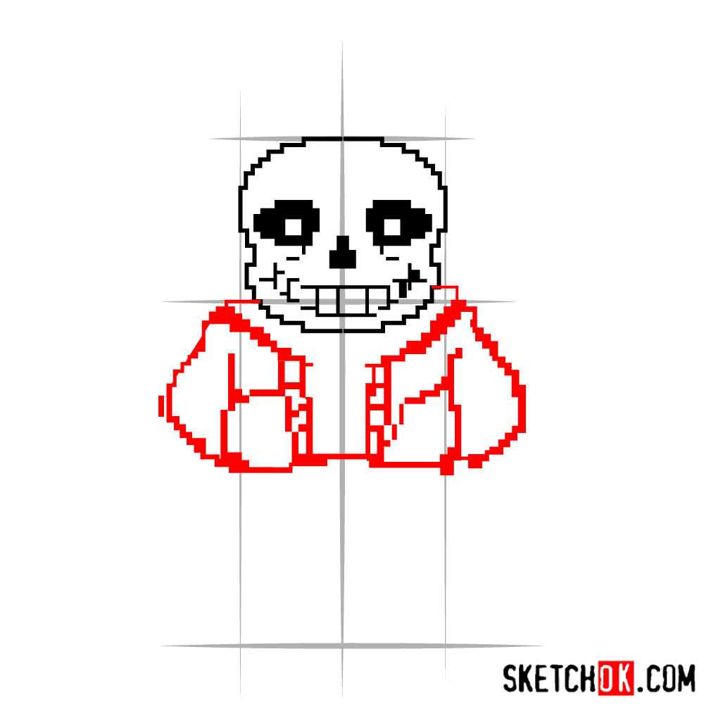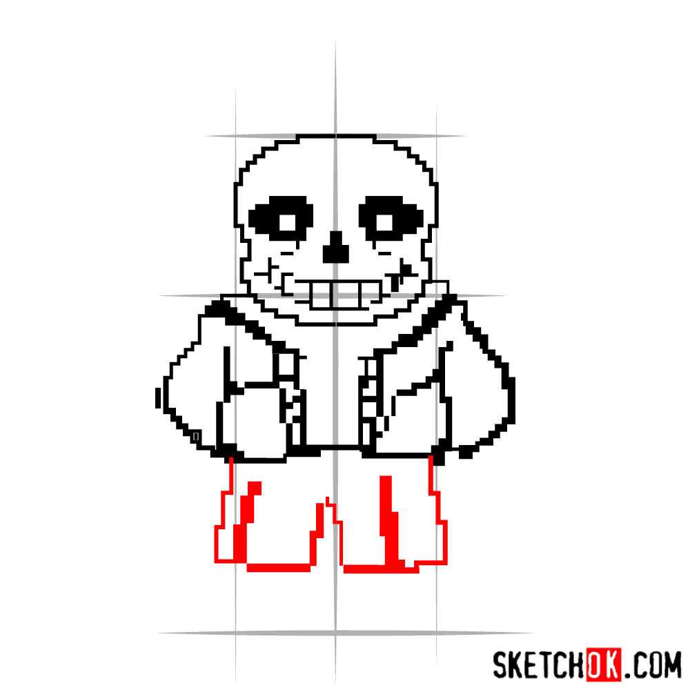 With the basic structure in place, it’s time to make your sketch. Start adding details to Sans’ face, clothing, and other features, while keeping an eye on the proportions. Make sure his blue hoodie, black shorts and slippers are accurate. Don’t forget his signature toothy grin!