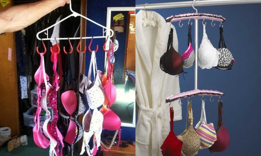 Отлично подойдёт и стандартная вешалка для одежды с несколькими крючками. Можно взять целую или купить крючки отдельно: в соответствии с количеством твоих бюстгальтеров. Прикрути вешалку к дверце шкафа или стену гардеробной.