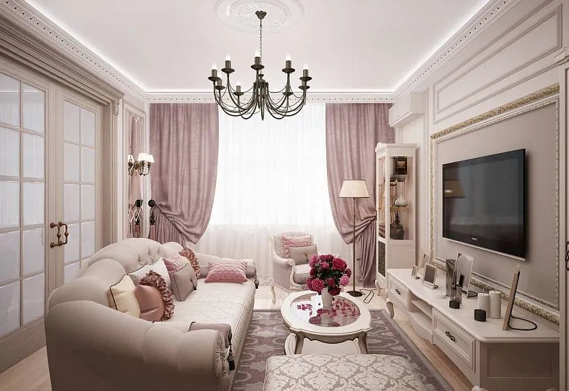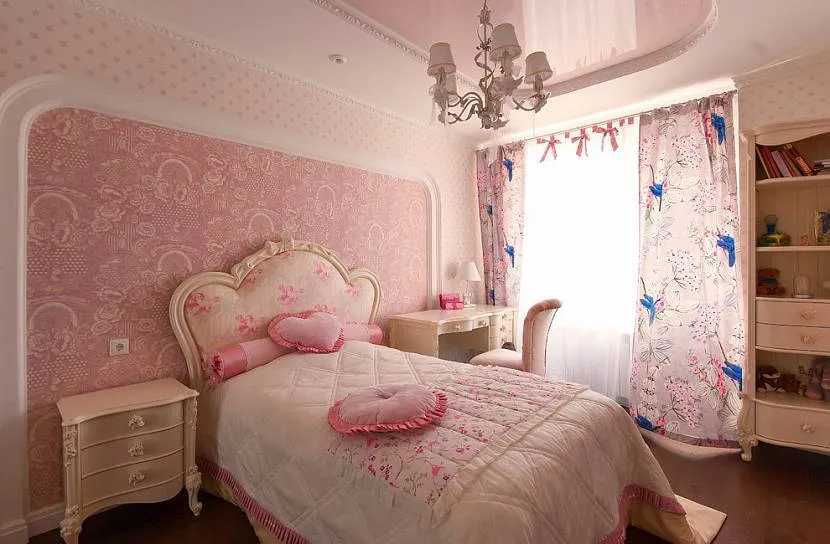 Для создания классического дизайна стены обычно оформляют однотонными розовыми обоями, которые дополняют мебелью плавных форм.