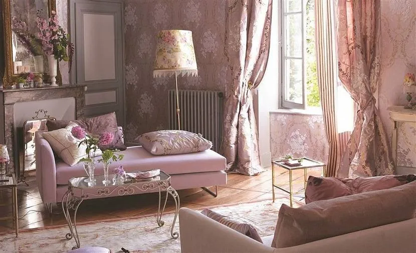 Для стиля «прованс» деревянные или кирпичные стены можно окрасить розовым или выбрать гарнитур такого цвета или занавески с растительным орнаментом. Хорошо дополняют розовые аксессуары комнату в скандинавском или минималистическом стилях, оформленную белым или пастельными тонами.