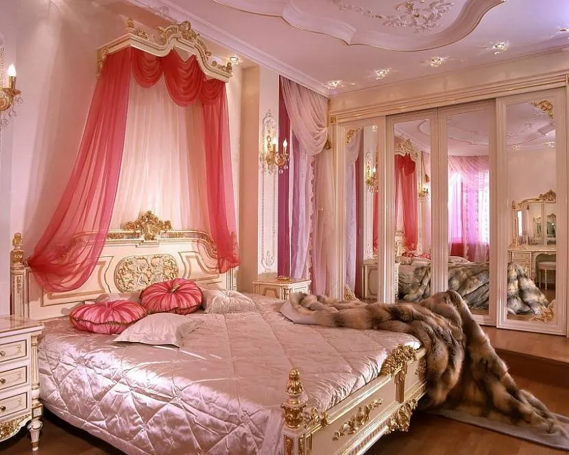 В розовом интерьере красиво смотрятся бархат, кожа, например, бархатная или кожаная обивка мебели в сочетании с золотой рамой зеркала или изящным позолоченным светильником. Прекрасно гармонирует такой цвет с натуральным камнем, мрамором, глянцевыми поверхностями, металлом.