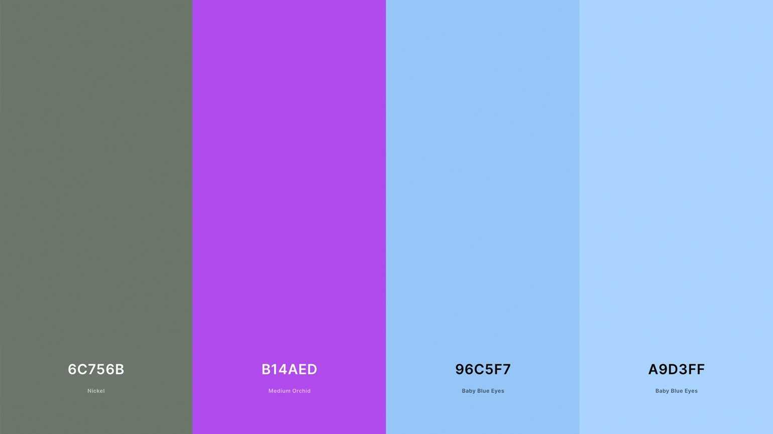 Универсальная цветовая схема с тёмно-серым, сияющим фиолетовым и двумя оттенками голубого: она подойдёт и для оформления свадьбы, и для айдентики финансового сервиса, и для бренда гранолы с «чистым» составом.