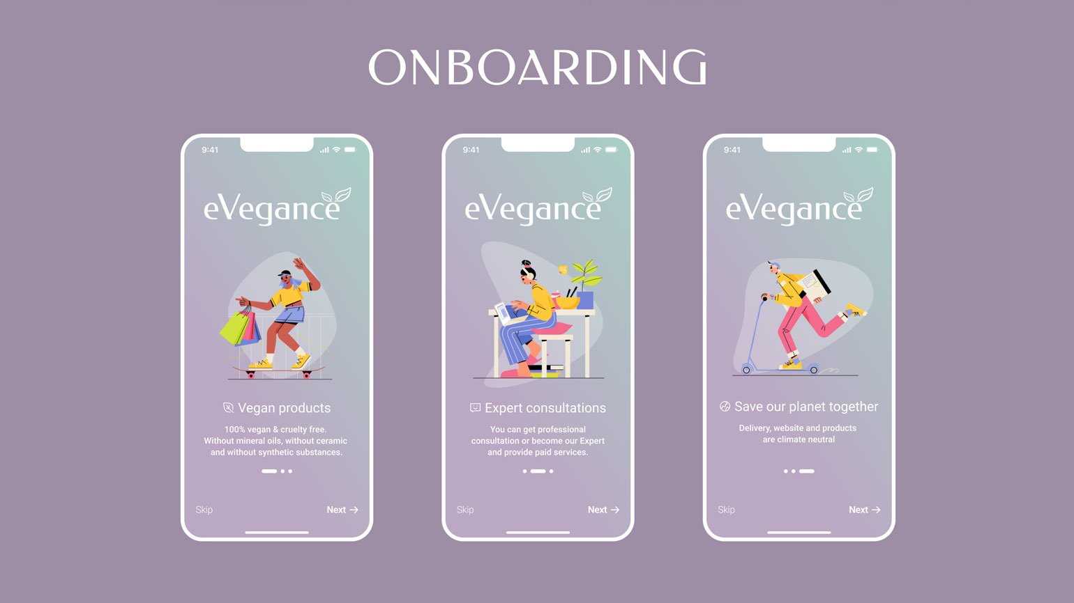 Дизайн экранов мобильного приложения для веганов с мягким градиентом — от шалфейного к фиолетовому.