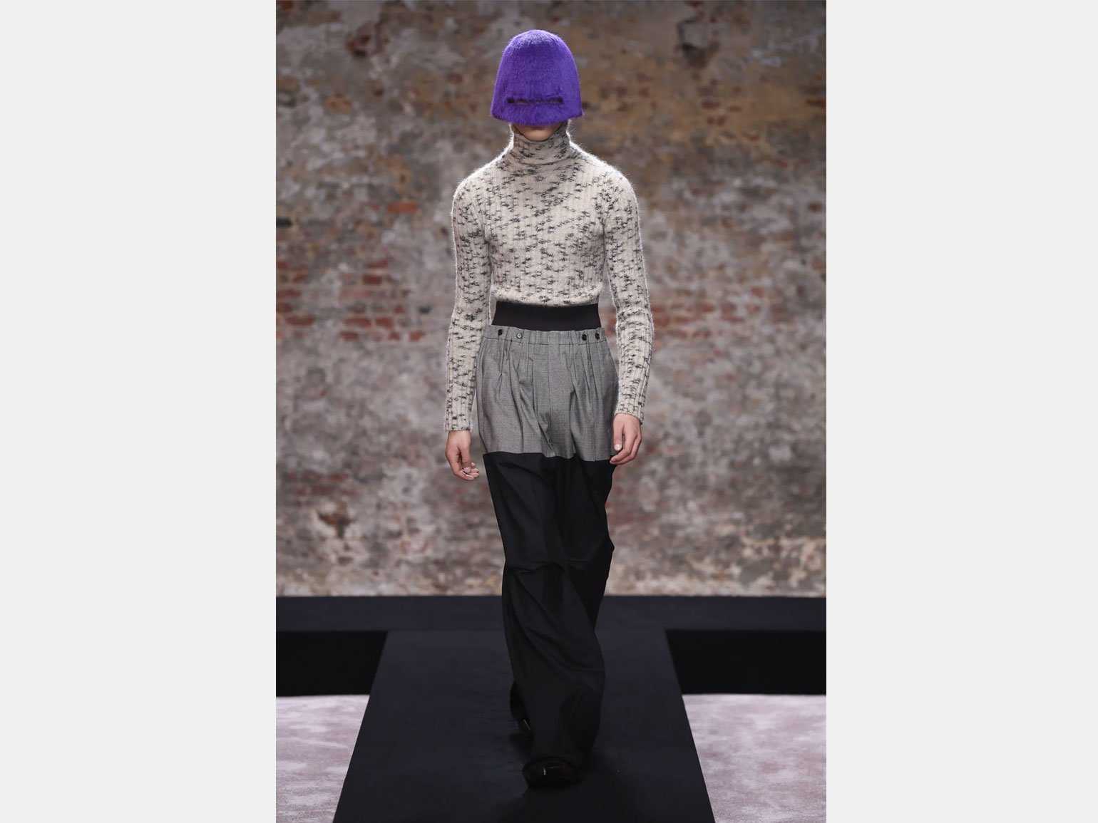 В образе Raf Simons из коллекции осень-зима — 2022 по-новому обыграно классическое сочетание: фиолетовый берёт на себя всё внимание, но при этом именно металлический серый цвет, обведённый рамкой из чёрного, выступает акцентом. Скриншот: сайт Distillo Caffe / Skillbox Media
