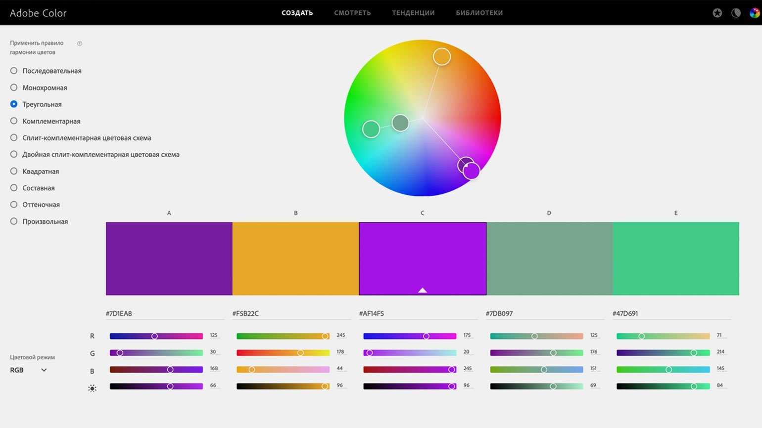 Треугольная схема с двумя оттенками фиолетового, приглушённым зелёным и апельсиновым. Такая яркая палитра подойдёт для сайта tech-компании или прогрессивного фитнес-центра.