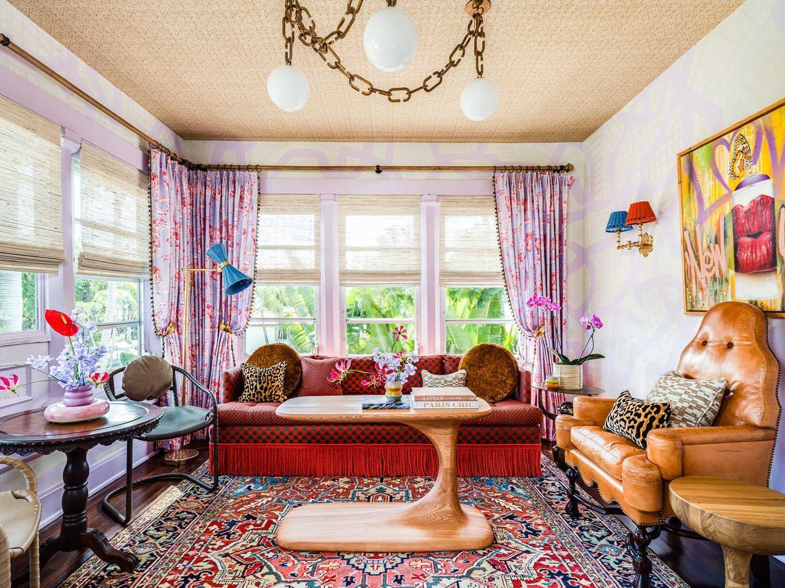 Эклектичный интерьер, который хочется бесконечно рассматривать. Нежный фиолетовый в паттерне на стенах и в оконном текстиле, оттенки бежевого, дерево помогают примирить антикварную мебель с гранж-искусством.