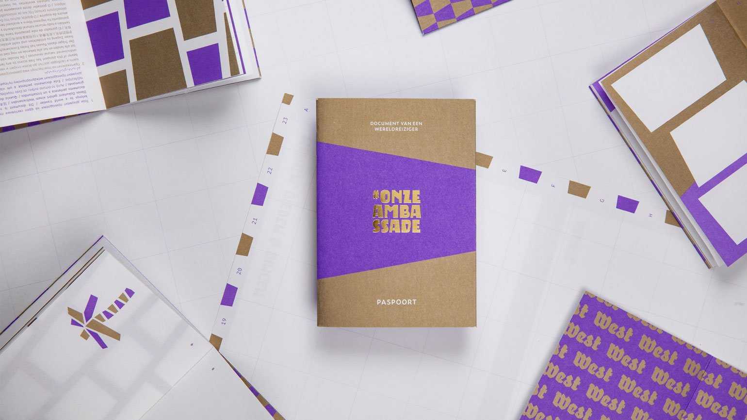 Визуальные решения на тему «моя идеальная страна»: тёплый бежевый и холодный фиолетовый в дизайне паспорта и стикеров.