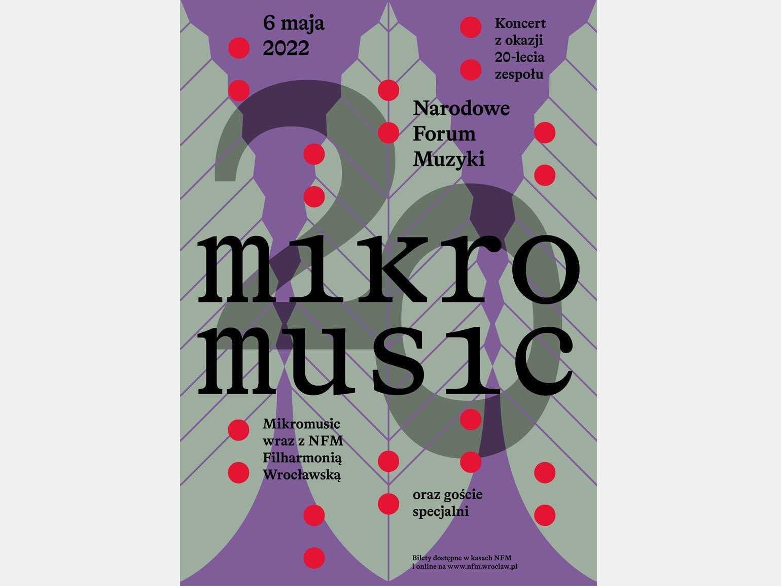 Плакат для концерта микромузыки: бодрящее сочетание спокойных оттенков — жизнерадостного лилового и шалфейного зелёного — с красными акцентами.