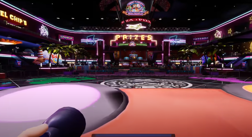 Далее можно сразу направиться в комнату Чики, где в подарочной коробке лежит билет. После его получения у вас есть 2 варианта действий – отдать его роботу из помещения с джунглями или пройти испытание Fazer Blast на первом этаже атриума. Просто предъявите пропуск охраннику и двигайтесь внутрь. Не забудьте зайти в расположенную слева комнату охраны – в ней найдётся пропуск 6-го уровня. Здесь же, в другой коробке, лежит билет на боулинг.