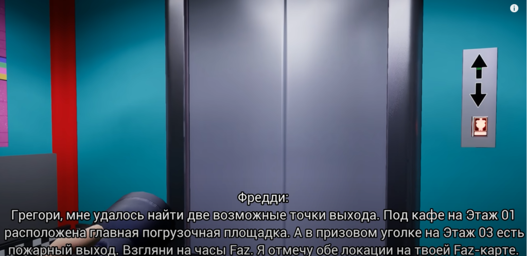 После того, как все 5 генераторов заработают, Луна вновь станет Солнцем. Но при попытке выйти из зоны через дверь возле поста охраны, оно поднимет тревогу. Так что вам придётся поторопиться и спрятаться в корпусе Фредди, чтобы не быть пойманным Чикой. Покинуть детсад можно тем же путём, что и войти в него – через ворота. Для того, чтобы добраться до зарядной станции выделяется 5 минут. На этом данный этап завершится и откроется доступ в центральные помещения – атриум. Пройдите мимо турникетов в вестибюле и поднимитесь на эскалаторе к лифту – теперь им можно пользоваться.