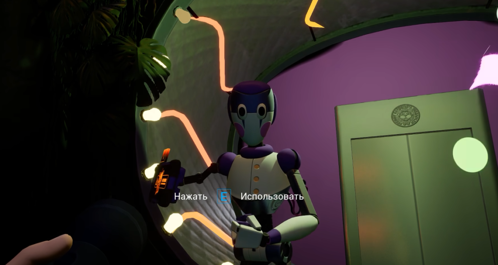 Выбравшись вы попадёте в просторный коридор, в котором находится дверь в комнату с роботом. Для её открытия понадобится пропуск, который можно найти в подарочной коробке, находящейся под картонной фигурой робота.