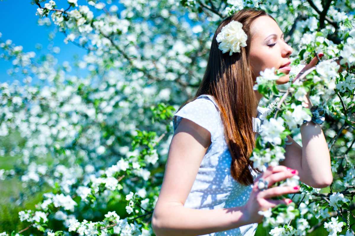 Фотопортрет девушки в цветущем саду среди ветвей