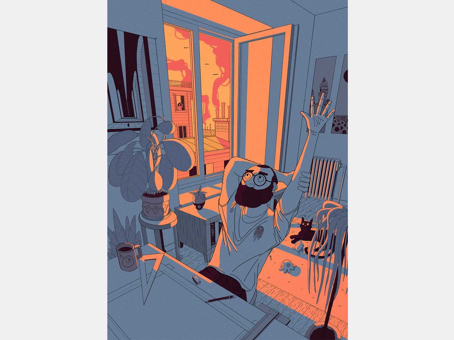 В иллюстрации использовано всего три цвета — сизый, пара оттенков оранжевого и чёрный для прорисовки контуров. Минималистичного сочетания серо-голубого и ярких цветов заката достаточно, чтобы создать настроение удовлетворения и усталостиИзображение: Hugo CHETOT / Behance