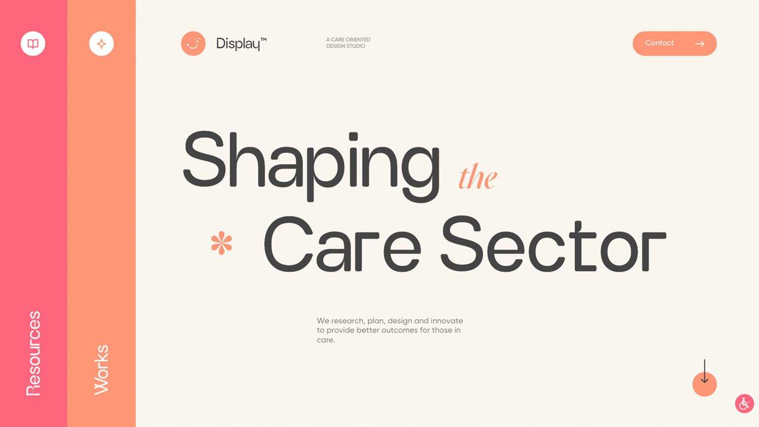 В оформлении сайта дизайн-студии, которая создаёт продукты для людей с ограниченными возможностями здоровья, использованы приглушённые оттенки розового и оранжевого. При этом они достаточно яркие, чтобы можно было заметить акцентные элементыСкриншот: сайт Display.care