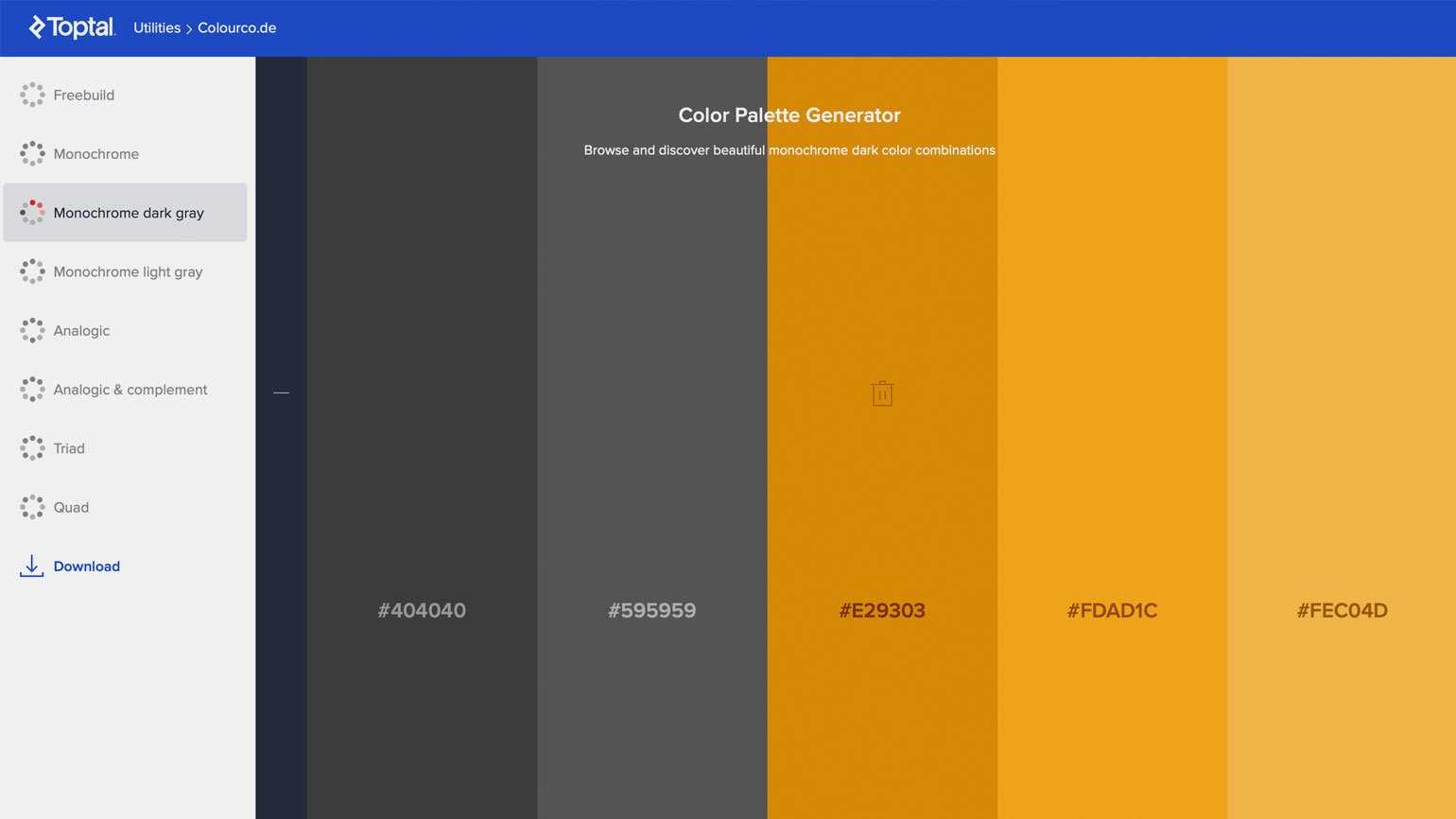Тёмная монохромная палитра: два оттенка глубокого серого и три оттенка слегка приглушённого оранжевого. Такое лаконичное сочетание цветов можно использовать для фирменного стиля премиальных товаровСкриншот: сайт Toptal / Skillbox Media