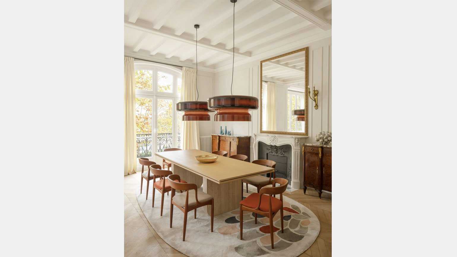 В дизайне столовой комнаты серый и терракотовый выступают как равноправные акценты и подчёркивают винтажный стиль интерьерных деталейИзображение: Fleur Delesalle / Vincent Leroux / Marset