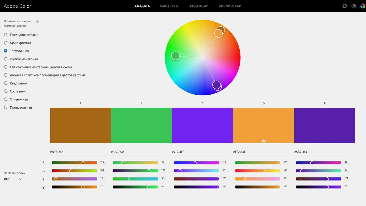 Фиолетовый дополняет броское сочетание оранжевого и зелёного в треугольной цветовой схемеСкриншот: Adobe Color
