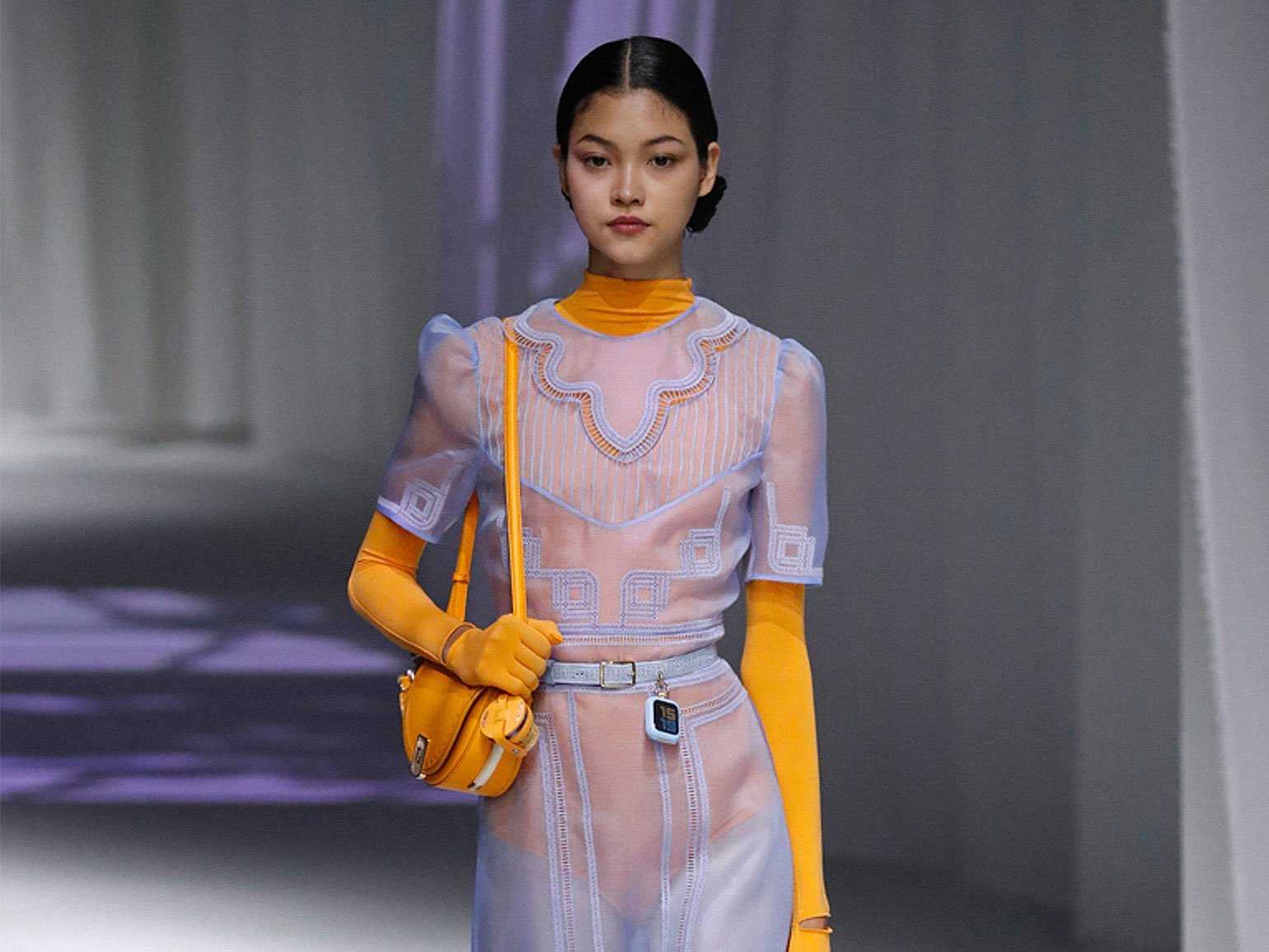 Весенний образ Fendi: полупрозрачное голубое платье приглушает и успокаивает солнечный оранжевый цвет боди. Обычно сочетание «голубой + оранжевый» характерно для tech-дизайна — как в интерфейсе часов на поясе модели. Но наряд показывает, что такая комбинация может быть и романтичнойФото: Estrop / Getty Images