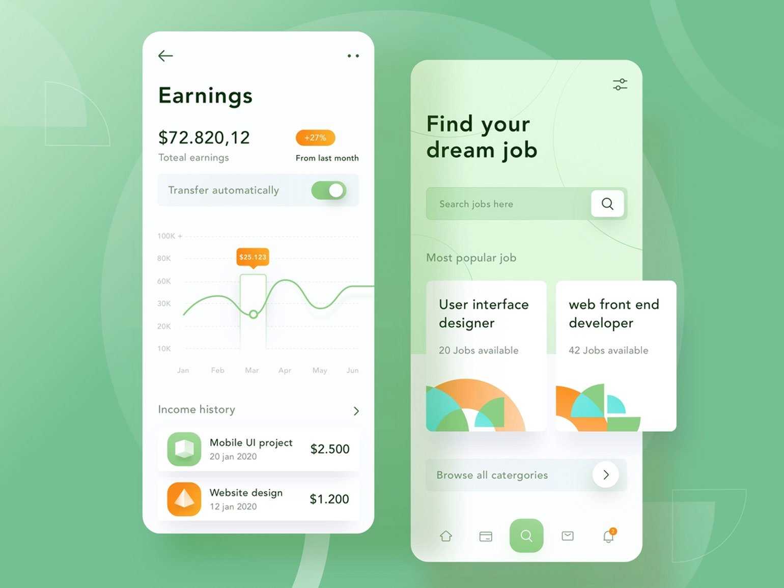 В дизайне приложения для поиска работы и контроля доходов использованы пастельные оттенки зелёного и оранжевого. Даже в приглушённых тонах это сочетание ассоциируется с бодростью и энергиейИзображение: Orely / Riko Sapto Dimo / Dribbble