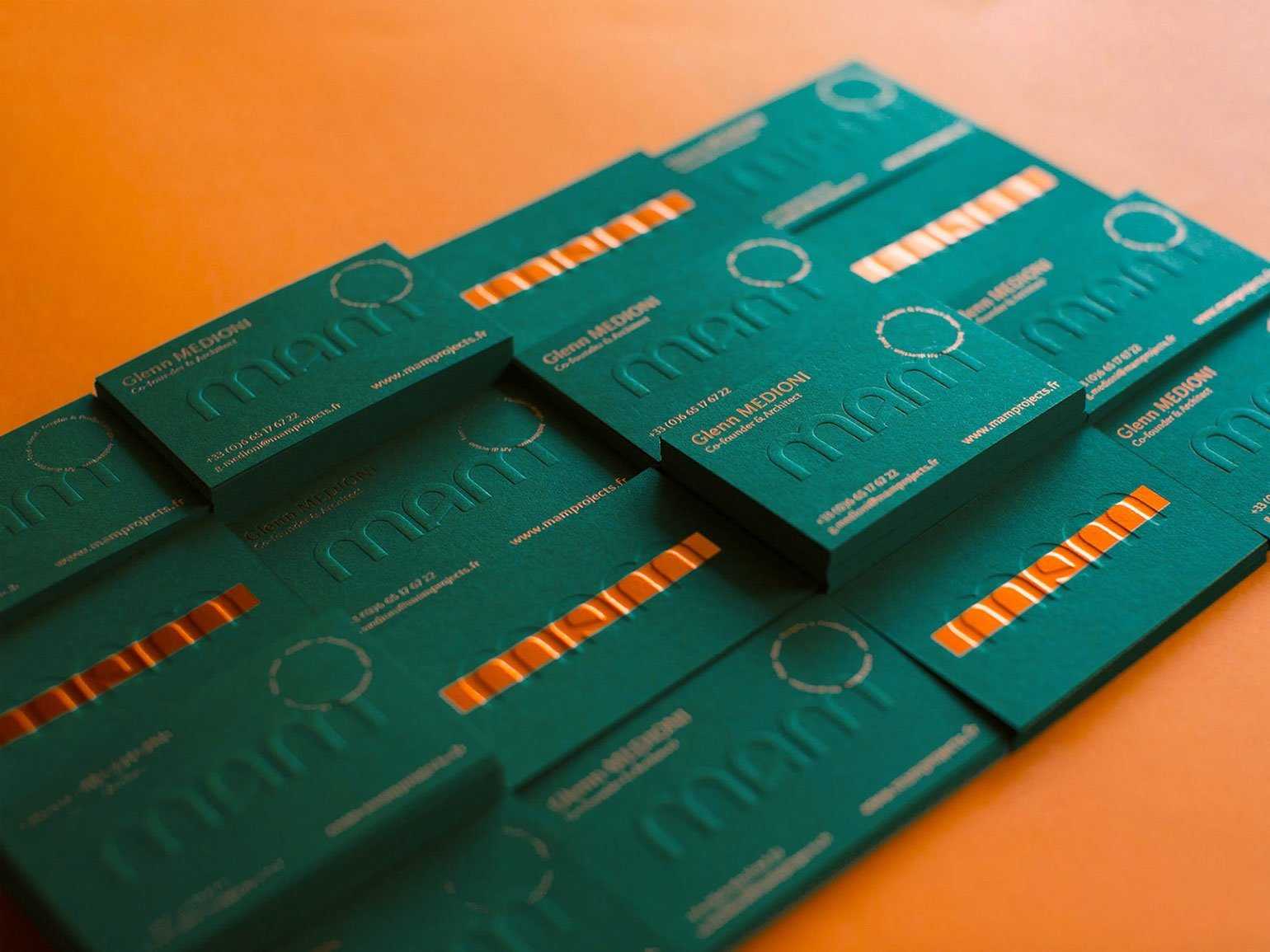 Визитки для студии, которая специализируется на визуальных решениях для ресторанов и отелей: блинтовой конгрев на картоне глубокого зелёного оттенка и фольгирование апельсинового цвета. По замыслу дизайнеров, это контрастное сочетание означает «дерзость, натуральность, мягкость»Изображение: Alex Arzuman Studio / Behance
