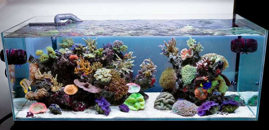 Коралловый Риф или Морской. Для его создания необходимо сотворить у себя в аквариуме настоящее море (соленая вода), с коралловыми рифами, растениями и характерными представителями таких глубин: тропическими морскими рыбками. Обычно в таком аквариуме довольно живописное дно и оформление, а количество рыбок сравнительно небольшое.