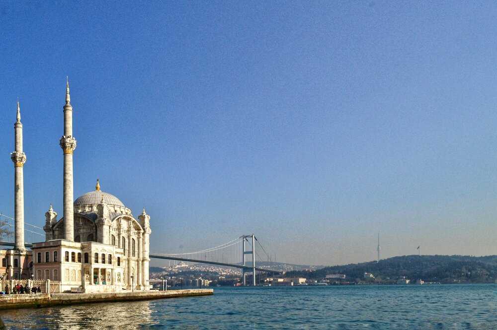 Захватите в кадр здание мечети, воды Босфора и мост Мучеников. Если повезет, то десятки летающих голубей дополнят картинку. Мечеть и мост красиво подсвечиваются ночью.
