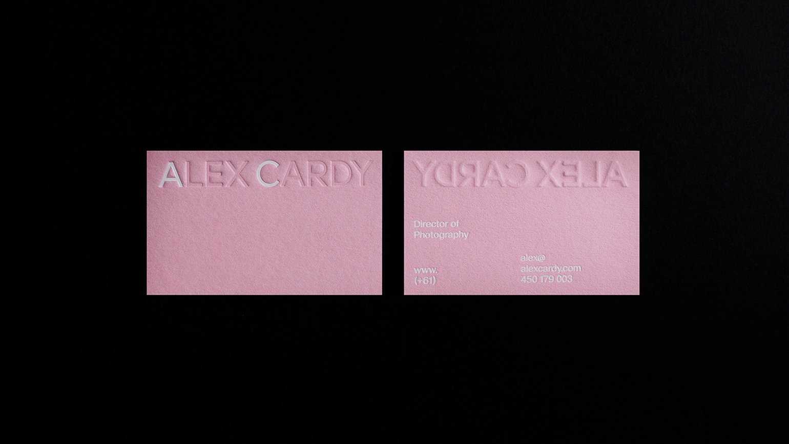 Белый на сплошном розовом может служить элегантным акцентом. На этой визитке сделано тиснение матовой белой фольгой начальных букв имени оператора-постановщикаИзображение: Thought & Found. / Behance