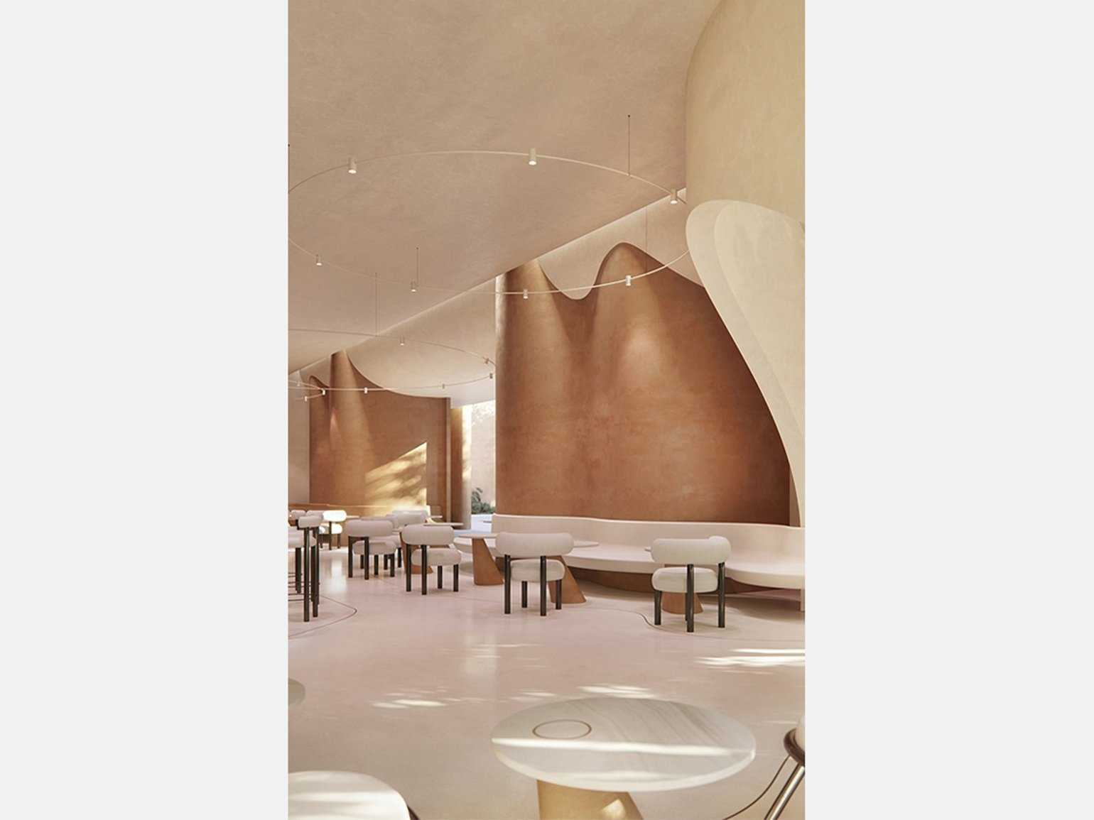 Минималистичный интерьер бара в Абу-Даби, в котором белый, нежно-розовый цвета, оттенок корицы, а также органические формы пространства и мебели работают как визуальное выражение слова sweetness — сладостьИзображение: KSh Design Bureau
