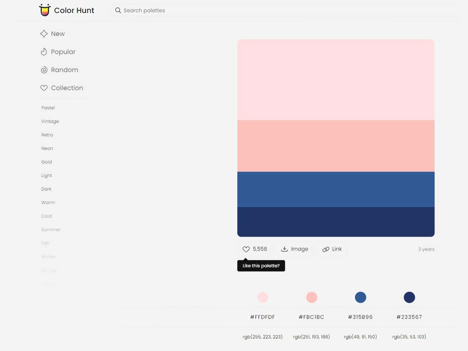 Готовая палитра со светло-розовым, персиковым, тёмно-голубым и глубоким синим. Благодаря такой схеме легко передать расслабленное настроение, поэтому её можно использовать для оформления сайта йога-студии или для дизайна бара на побережье — и Эгейского моря, и БалтийскогоСкриншот: сайт Colorhunt / Skillbox Media