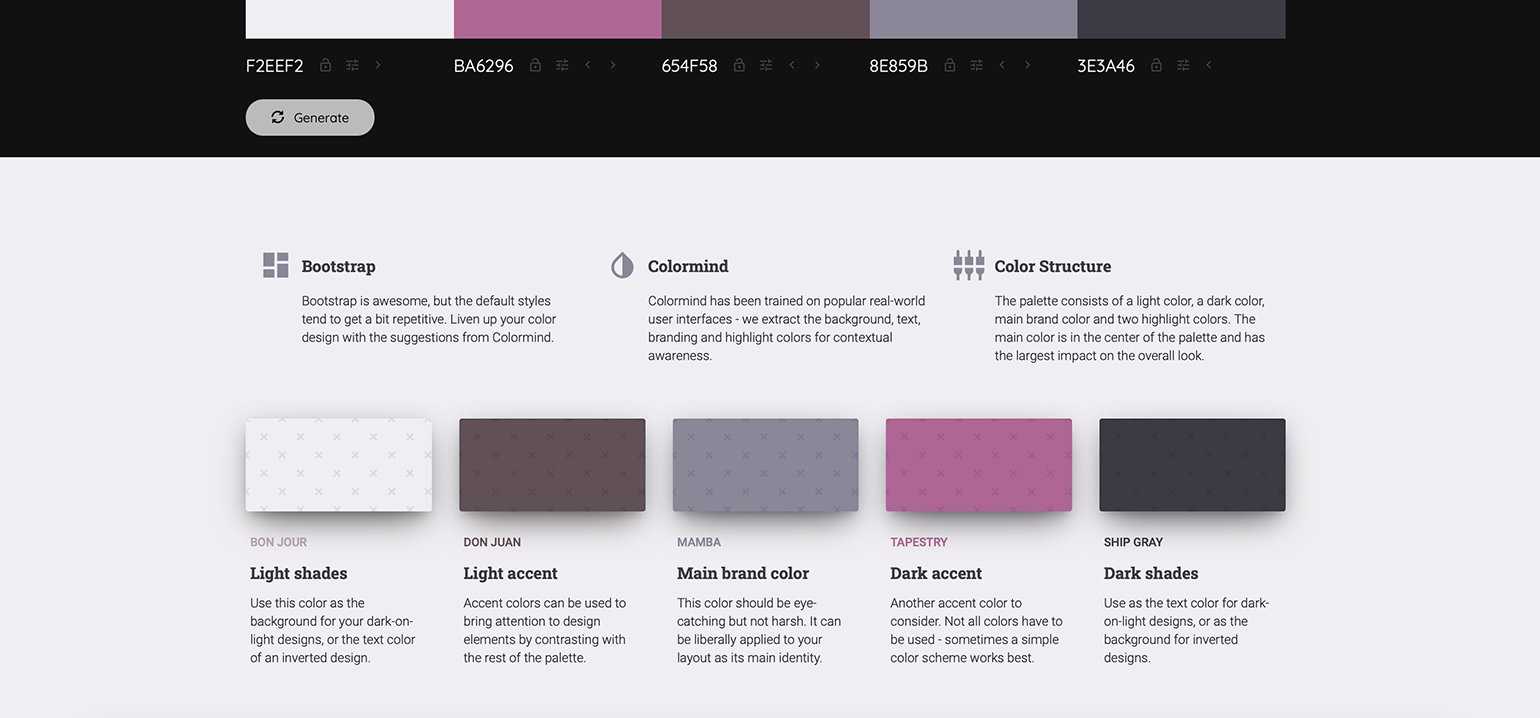 Пример палитры для сайта или приложения: белый фон с едва уловимым розоватым оттенком и акценты холодного розового цвета. Такую схему, например, можно использовать в дизайне онлайн-магазина свадебных платьев или для сайта ветеринарной клиникиСкриншот: сайт Colormind / Skillbox Media