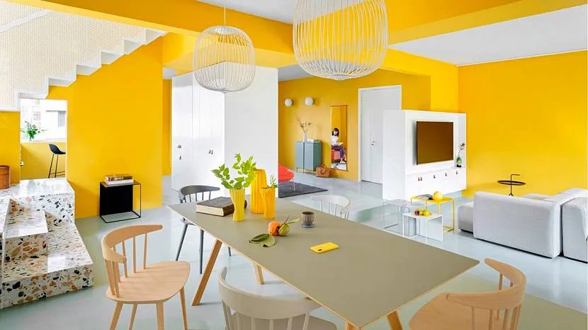 Белые и желтые стены в интерьере просторной квартирыИсточник jhint.ru