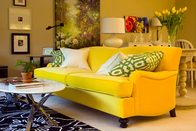 Желтый диван в интерьере с белым журнальным столиком, светильником и подушкамиИсточник mainavi.ru