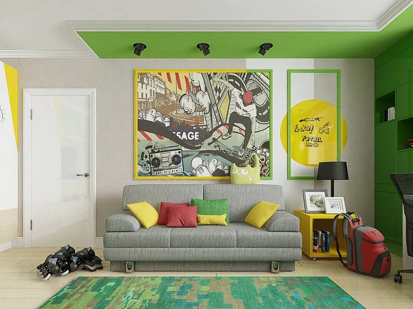Он используется в ночных шторах, принтах, постерах, картинах, декоративных подушках и футлярах на мебель. Иногда в одном из оттенков желтого – горчичном, соломенном может быть ковролин в гостиной, прикроватный коврик.