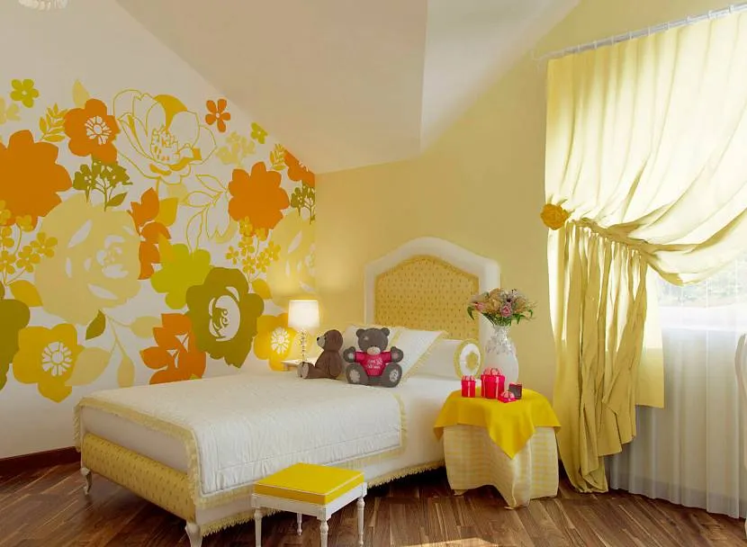 Цветочные узоры создают летнюю атмосферу в доме. Яркие объемные цветы на желтом фоне могут украшать какую-либо зону в квартире, например над телевизором или кроватью. Светло-желтыми обоями с мелким неброским цветочным рисунком можно отделать весь периметр.