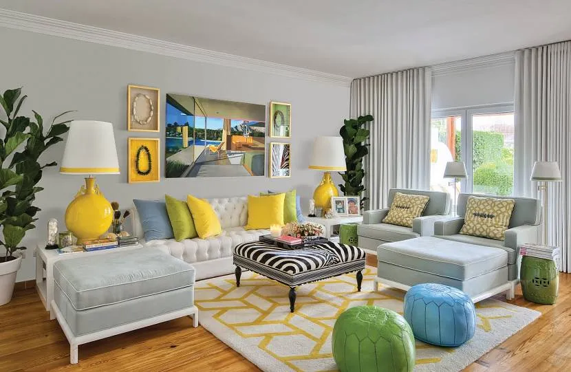Желтый оттенок в кресле, коврике, декоре дивана в большом залеИсточник pinterest.nz