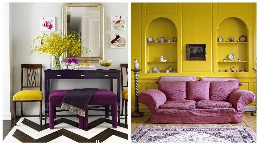 Сочетание цвета в интерьере: бледно-желтый, бледно-лиловый и аметистовый можно встретить в творениях французских дизайнеров. Насыщенная колористка и роскошь – визитная карточка столицы моды. Вы можете подражать ей, но учтите в таких оттенках лучше оформлять гостиную салонного типа: много огней, частые гости, музыка, различные игры. Так же можно оформить кафе или женский клуб. Помещение должно быть комфортным, с мягкими диванами и креслами, журнальными столиками, картинами, роскошными аксессуарами. На полу желательно постелить ковер или ковровое покрытие. Если нужно добавить шкаф или стулья, используйте светлое дерево, например клен, но стулья обязательно с тканевой обивкой.