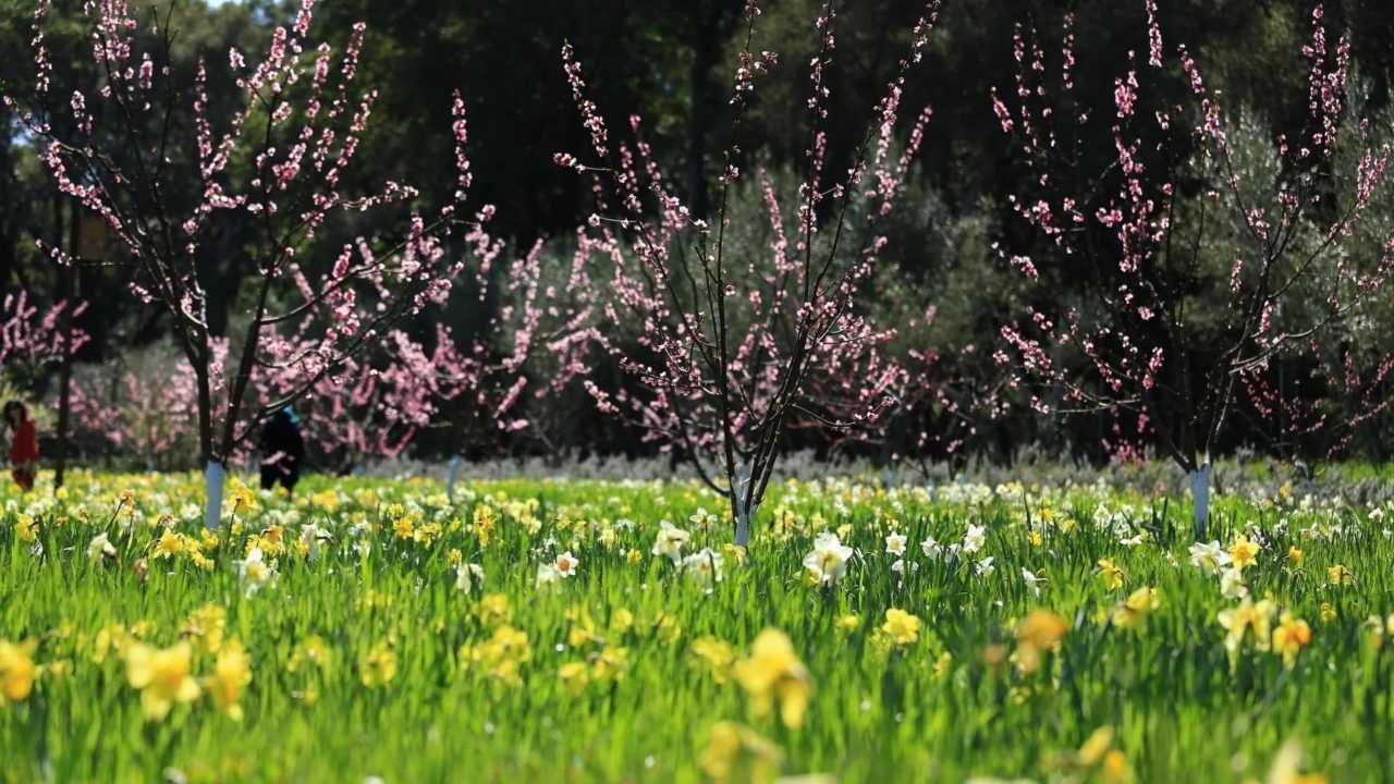 Цветение на дереве на фоне нарциссов на земле