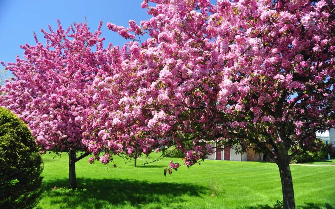 Огромные кроны цветущих деревьев переплелись над идеальным зелёным газоном