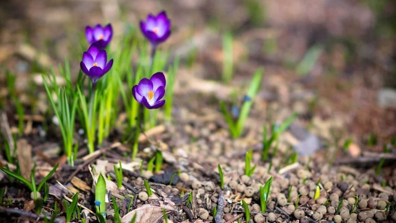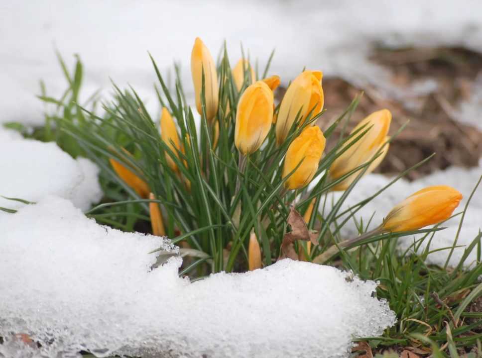Первая травка и цветы, пробивающиеся из увлажненной талым снегом почвы