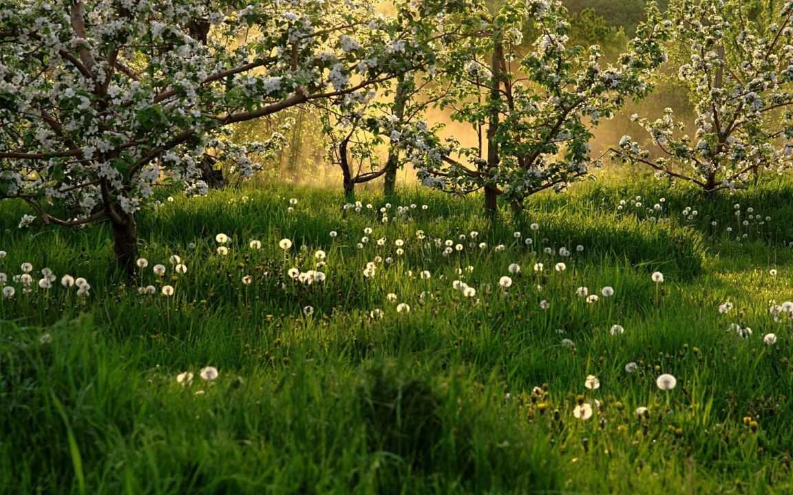 Яблони и пушистые одуванчики. Дачная атмосфера