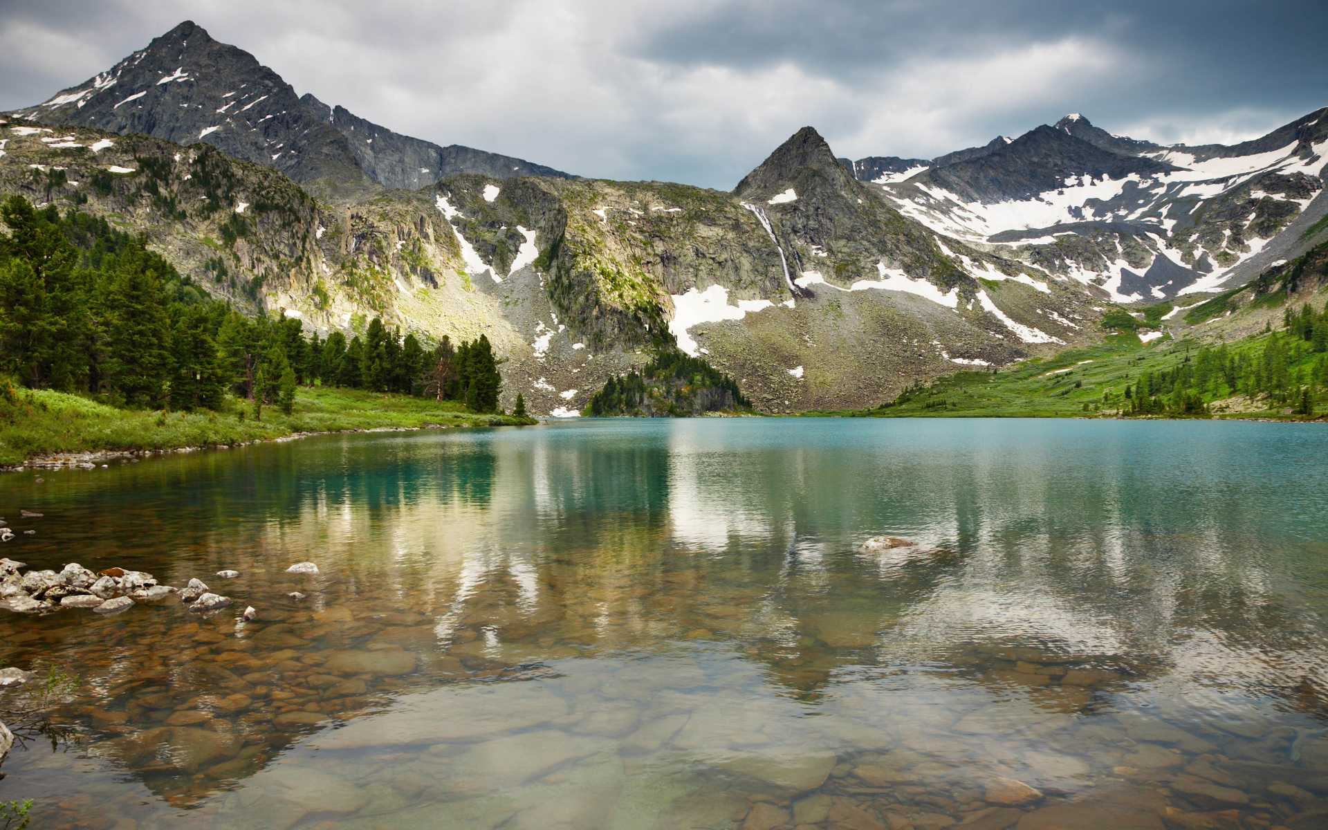 Красивое озеро с зеленью на берегу