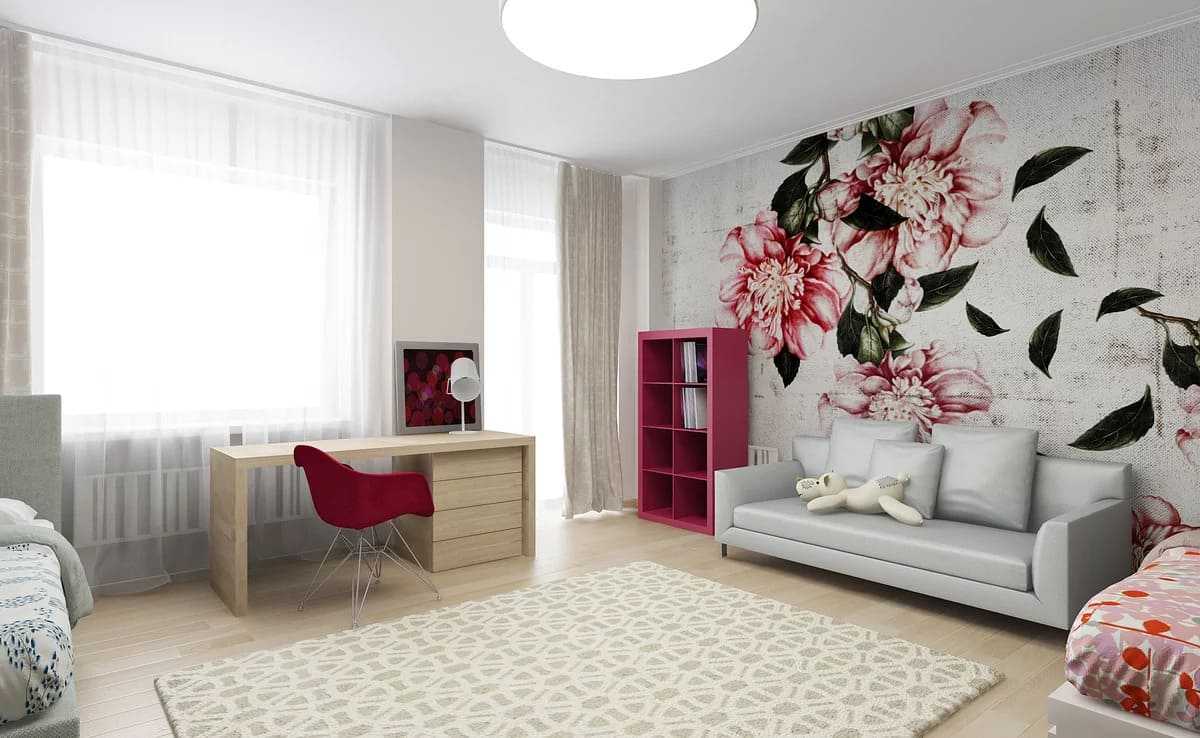 Не менее оригинально выглядит стена с цветочными мотивами письменного или туалетного столика.