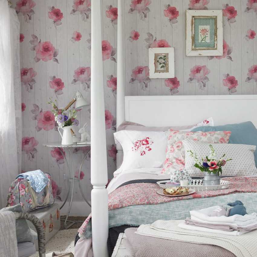 В изголовье кровати можно разместить фотообои с растением или цветочным узором или изящной надписью
