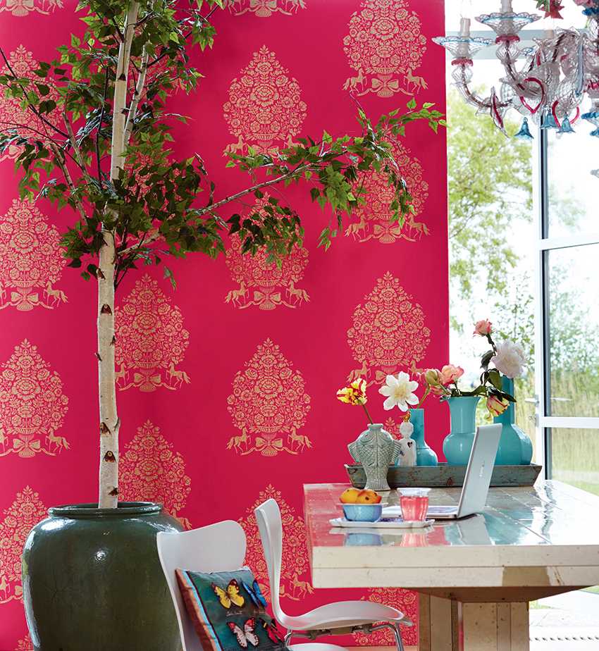 Ярко и эффектно смотрятся розовые обои на тему животных или растений