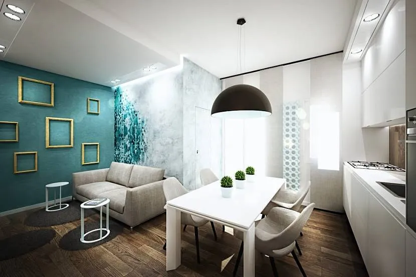 Кухня, которая совмещается с гостиной, обязательно имеет повторяющиеся черты. Оттенки и декоративные элементы отлично смотрятся с белоснежными потолками и кремовой мебелью-стенкой. В зоне отдыха предусмотрен мягкий бирюзовый диван, на котором прекрасно смотрятся воздушные подушки коричневого, серого и белого цвета.